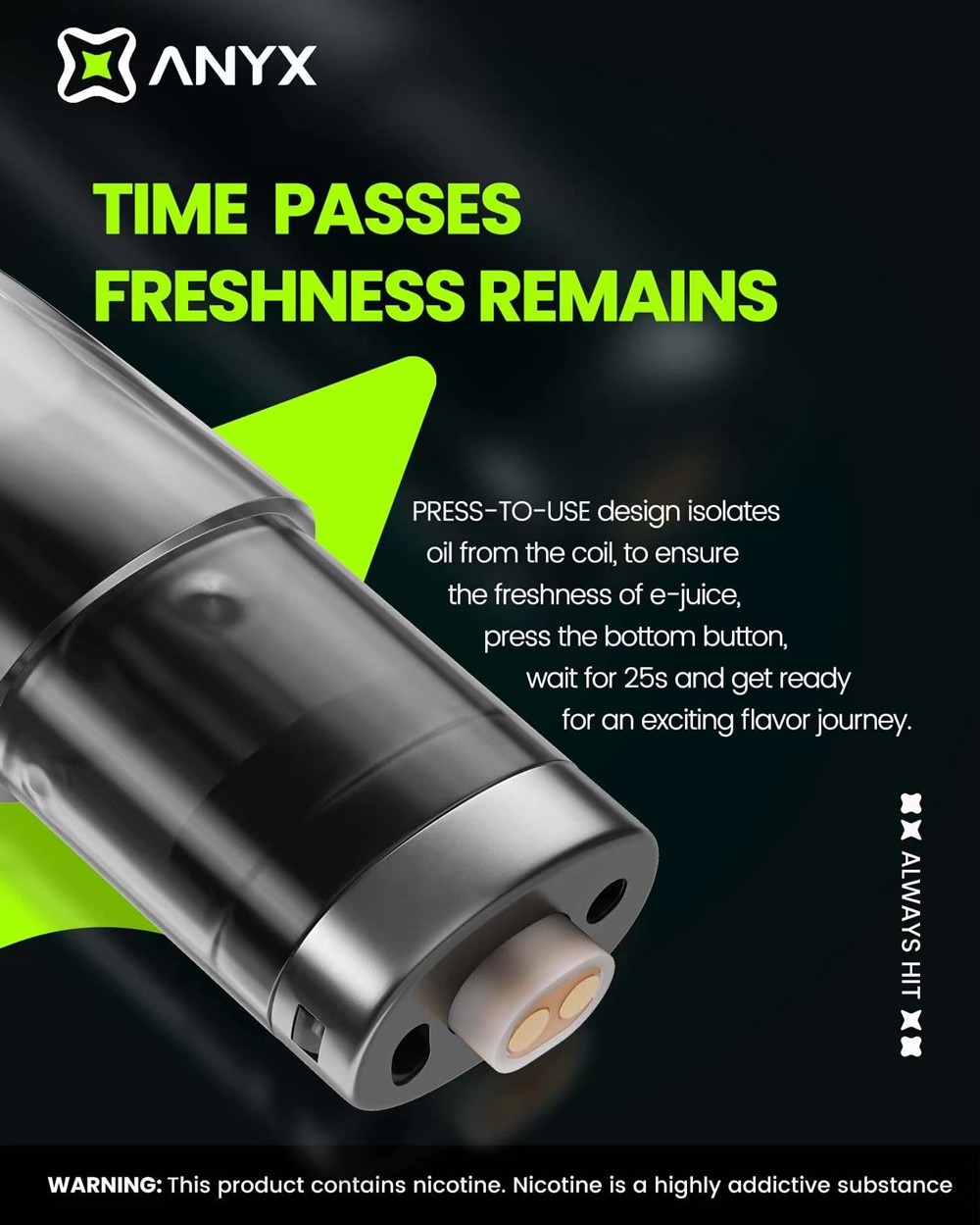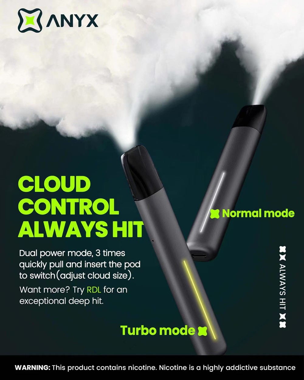 Som världens första riktiga dual-mode slutna pod-system är ANYX PRO utrustad med MCU intelligent temperaturkontrollchip och stöder Restricted Direct-Lung (RDL) -läget, vilket ger en omedelbar men särskilt annorlunda upplevelse, beroende på valt läge: den starka och täta smaken av Turbo-läge, tillsammans med den känsliga och mjuka upplevelsen av normalläge. ANYX PRO är utformad för att tillfredsställa vapers olika preferenser och lovar en rikare smakupplevelse.