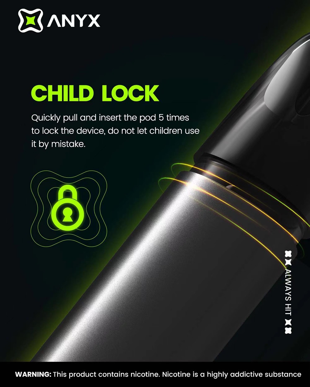 I ett steg för att maximera säkerhet och tillförlitlighet kommer ANYX PRO med barnlåsfunktionen för att förhindra att minderåriga hanterar och använder produkten.